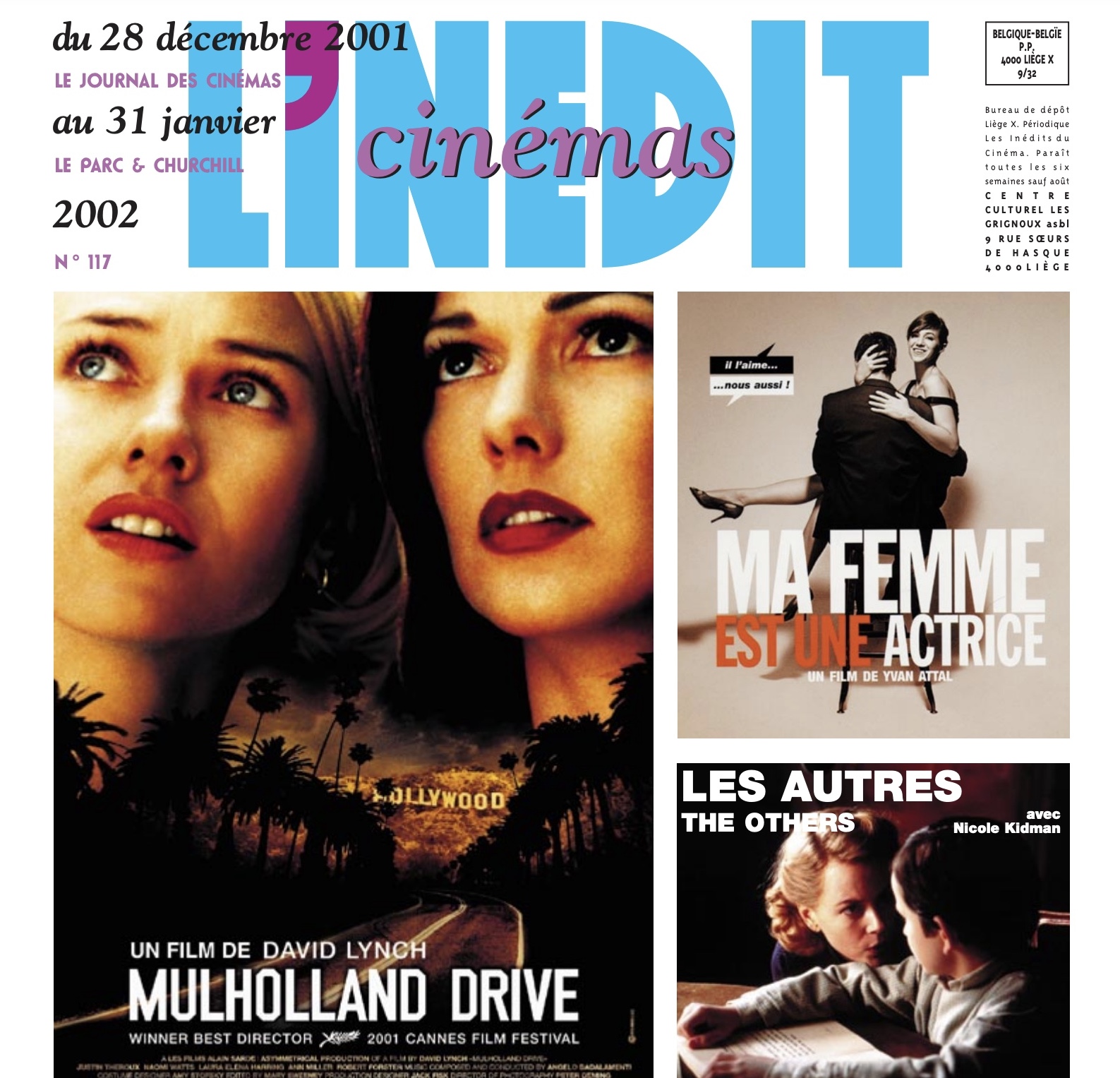 Hier, le rideau s’est baissé sur l’un des plus grands rêveurs du cinéma. DAVID LYNCH était à l’origine de la « cinéphilie » de beaucoup d’entre nous aux Grignoux, à commencer par Michel Condé (Lynch était son réalisateur préféré) ou le regretté Jean-Pierre Pécasse (qui avait même réussi à acquérir deux oeuvres graphiques originales du réalisateur, au festival de Locarno !). Eraserhead a été l’un des premiers films-phénomènes du cinéma le Parc. Dans toutes nos salles, nous avons frissonné aux côtés d’Elephant Man, tremblé dans les ombres bleues de Blue Velvet, parcouru les routes incandescentes de Sailor et Lula ou celles, plus sinueuses encore, de Mulholland Drive. Ce dernier était à la Une de L’Inédit en 2001 (illustration) et a été remis à l’honneur sur nos écrans en décembre 2022. Nul doute que d'autres le seront encore un jour. La route ne finit jamais tout à fait, comme Lynch nous l’a lui-même appris… " It's a strange world, isn’t it? ". Nous saluons l'oeuvre de cet architecte de l’étrange qui va nous manquer.
