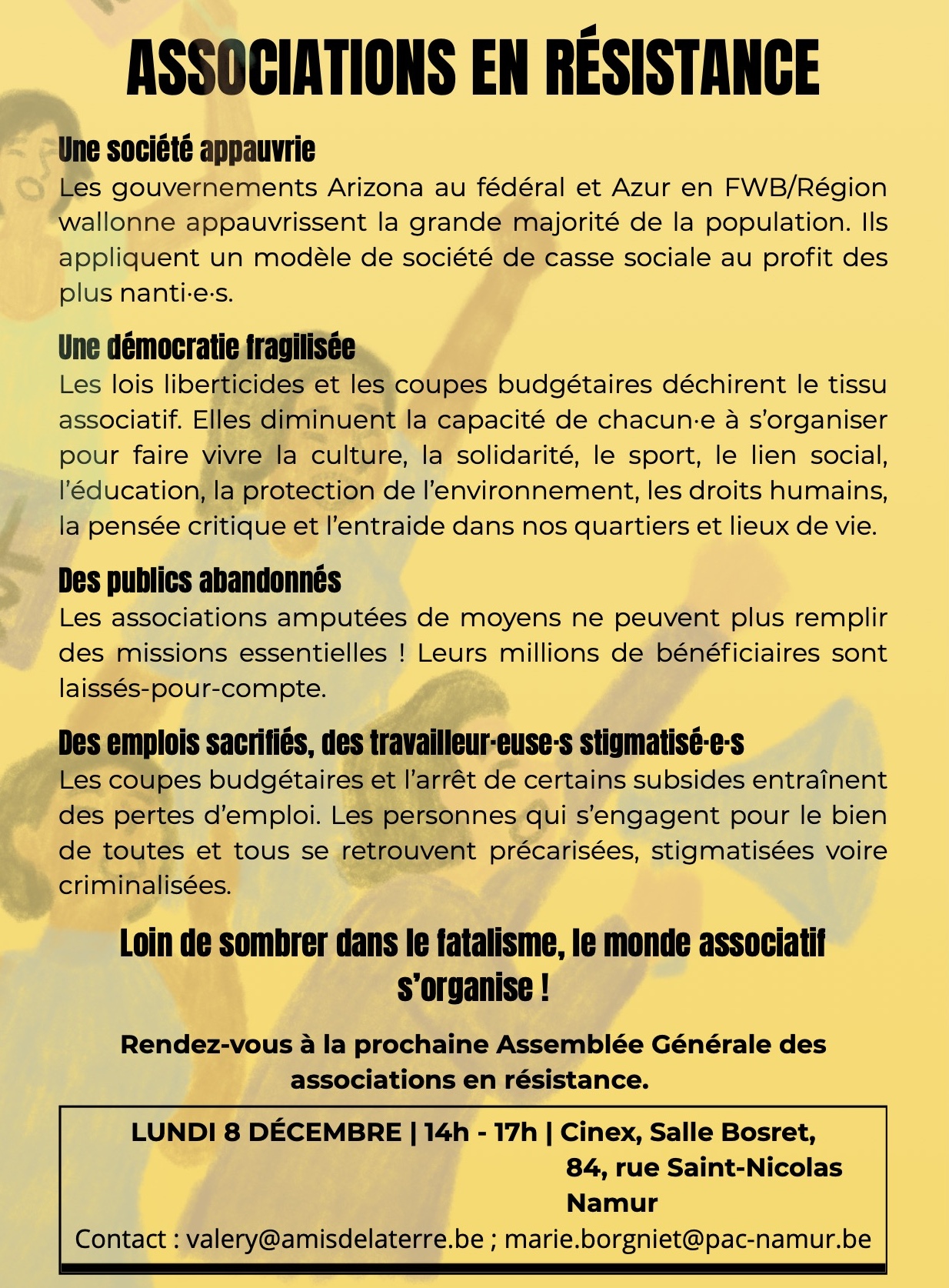Mercredi 26/11, comme hier et comme demain, les Grignoux s’associent aux démarches de résistances, qu’elles soient syndicales, citoyennes ou associatives pour défendre un modèle de société solidaire et inclusif, contre les mesures prises par les gouvernements.