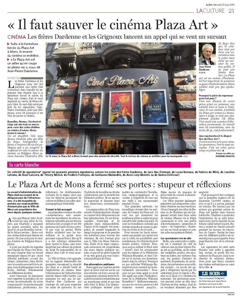 PLaZa aRT • Ami·e·s cinéphiles, bonjour. Nous cosignons ce jour dans le journal Le Soir une carte blanche pour la sauvegarde du Plaza Art à Mons, aux côtés de 40 professionnels du monde du cinéma belge. Merci de soutenir les travailleurs de ce haut lieu culturel et de partager l'info. Les Grignoux.
